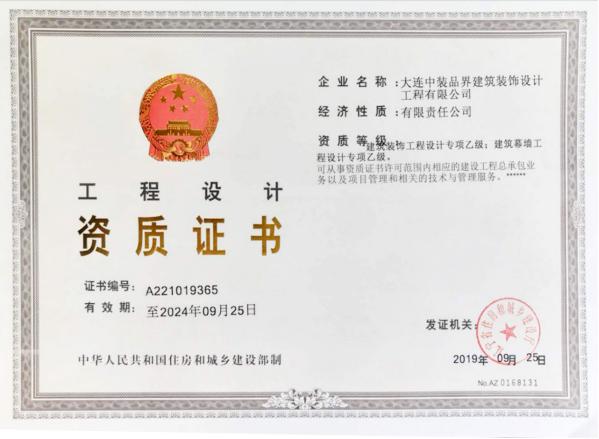 大連中裝品界建筑裝飾設計工程有限公司是集設計和施工為一體的建筑裝飾企業。公司成立于2015年,具有建筑裝修裝飾工程專業承包貳級、建筑幕墻工程專業承包貳級、建筑裝飾工程設計專項乙級、建筑幕墻工程設計專項乙級等行業資質證書;2019年被評為遼寧省AAA級信用企業;同年被評為全國誠信建設百強信譽AAAAA級企業。